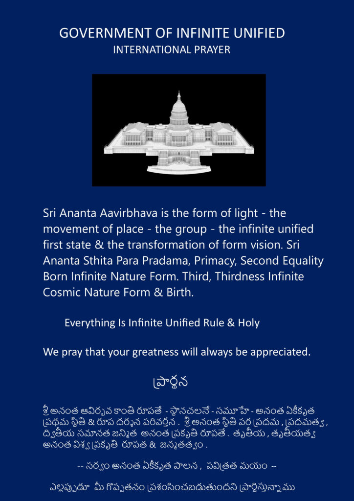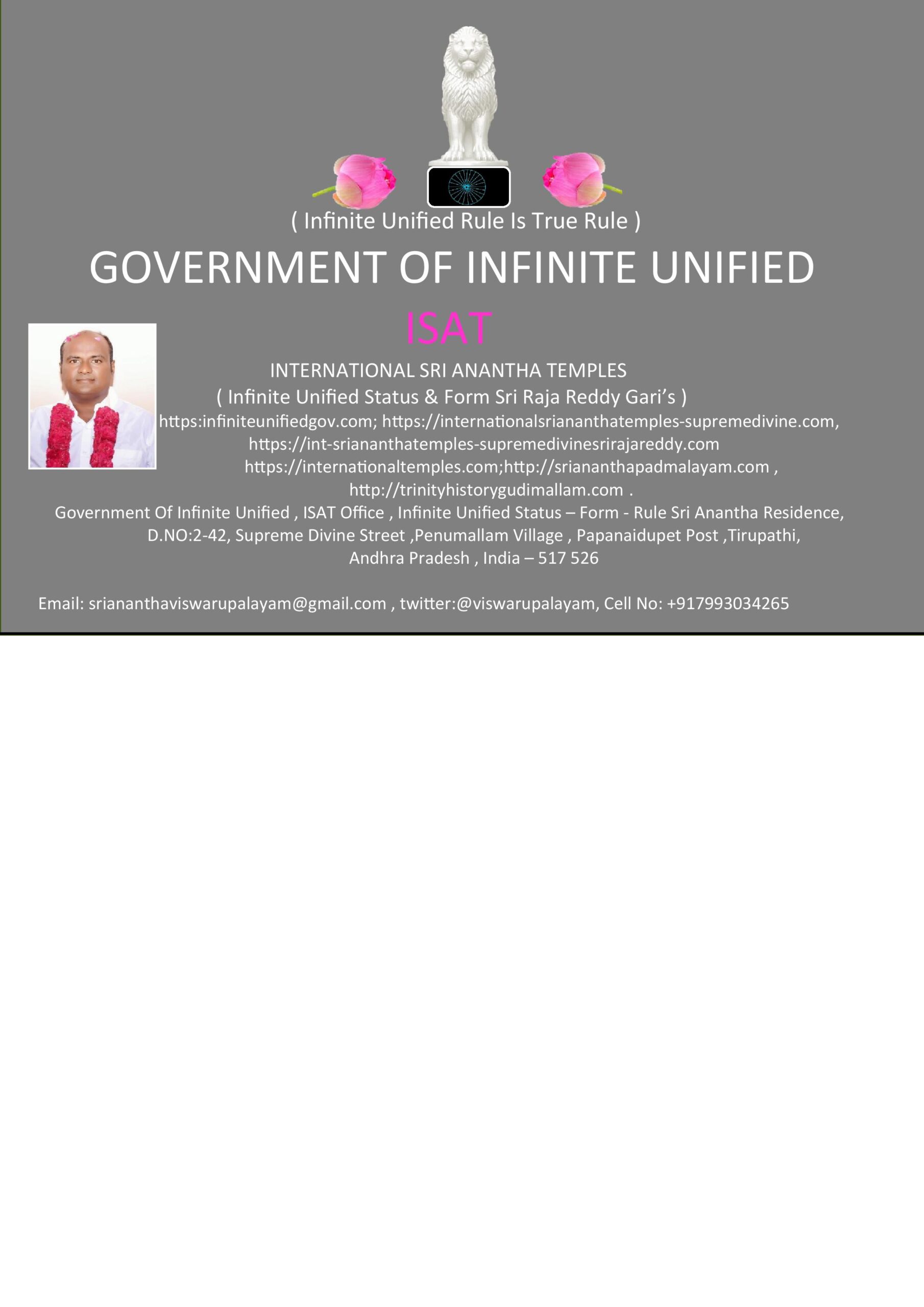 SRI ANANTHA GOVERNMENT WHITE SENATE White Senate :A Senate that conveys the purity of Sri Anantha’s unified governanceశ్రీ అనంత ఏకీకృత పాలన స్వచ్ఛతను తెలియజేయునటువంటి తెలుపు సభ .The Picture :Sri Ananta Status Padmata, the image of the purity of Sri Anantha Form turning into a lotus foot.శ్రీ అనంత స్థితి పద్మత శ్రీ అనంత రూప పాద పద్మము గా మారినటువంటి పవిత్రత చిత్రం . Sri Anantha International Flag COLOURS & WHEEL MEANING : – Orange (Fruit ) : – The infinite unified form is the natural color.White : – Purity ( Svacchata ) ,Green : – Informs Cosmic Nature , Wheel :- Infinite Unified Time Wheel , Sky Blue Colour This Lion & Wheel Imgs is Sri Anantha Infinite Unified Status Related Sri Anantha & Pradhama Rupa Rupini – Rupa Rupudu Sri Anantha Govt Sacred Letter Sri Anantha Govt Img Sri Anantha Govt Sacred Letters Sri Anantha Govt Sacred Letters Sri Anantha Govt & Temples Sacred Letters Unvoting , World First CitizenThe Infinite Unified Form Of Sri Anantha Is Also Called This Sri Anantha Govt Sacred Letters Sri Dr.B. Umapathi Reddy Garu , Highe Person , H ( హైజ్ పర్సన్ )Smt B. Sakunthalamma Garu , Viswa Virtue Mother Figure Sri Anantha Government White Senate Process The Government Of Infinite Unified Policies Were Firstannounced on 08-07-2025 . The Government Of Infinite Unified Policies Were Firstannounced on 08-07-2025. Sri Ananta Unified Rule Status Similarity Form in Government .ప్రభుత్వము నందు శ్రీ అనంత ఏకీకృత పాలన స్థితి సారూప్యత రూపం . INTERNATIONAL PRAYER & PROMISE Sri Anantha Infinite Unified Time Rotation Light Sri Anantha Infinite Unified Status Lion , International Emblem( PROCESS ) Sri Anantha International Flag Sri Anantha International Flag